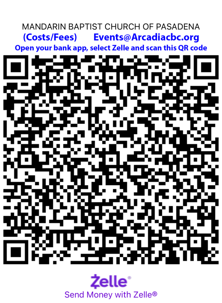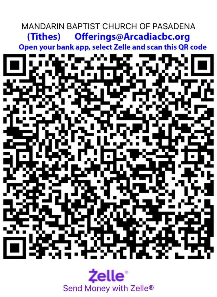 Zelle Account name: Mandarin Baptist Church of Pasadena (MBCP)
