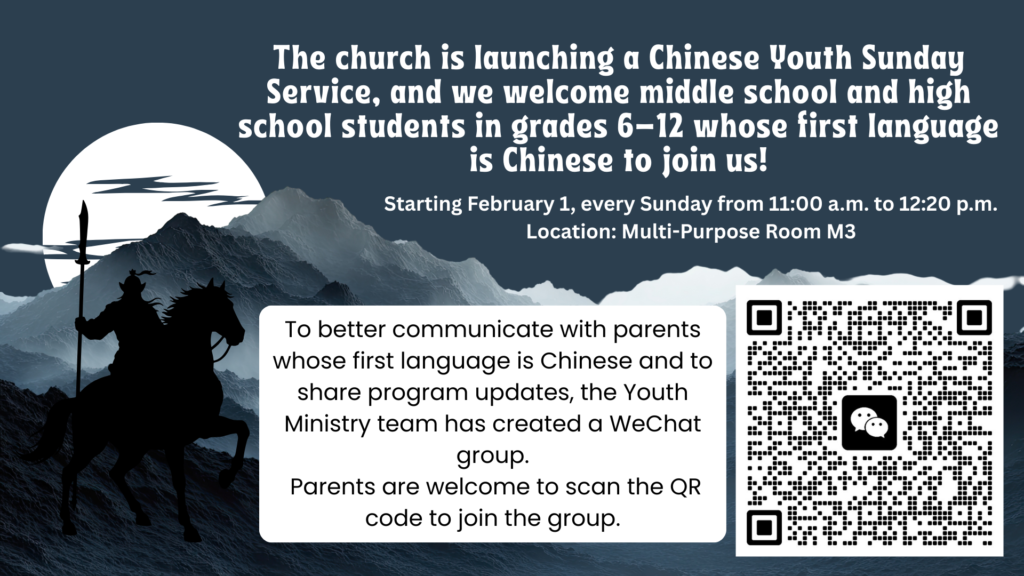 We offer classes in both English and Chinese. There are four different levels tailored to each student’s understanding of the Gospel and the Bible, ensuring every youth finds the learning environment that best fits their needs.