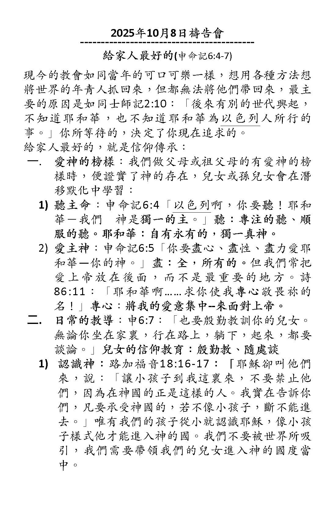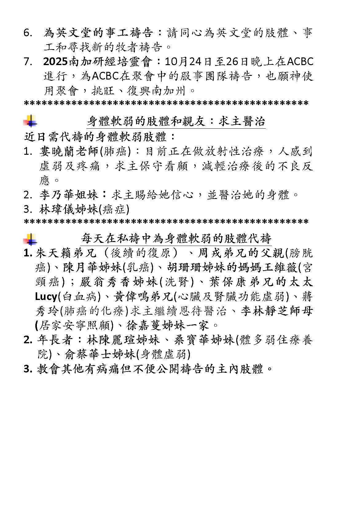 有興趣參加禱告會,或對禱告會有任何問題的弟兄姊妹,歡迎聯繫:國語禱告會:Wenyuan Zhong wendyzhong20090202@gmail.com英文禱告會:Anna Wong annaw.cls@gmail.com